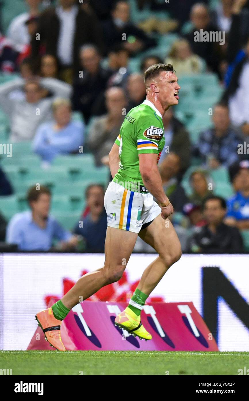 Jack Wighton Von Den Raiders Feiert Nachdem Er Beim Ersten Nrl Halbfinale Zwischen Den Sydney Roosters Und Canberra Raiders Am Scg In Sydney Freitag 9 Oktober 2020 Einen Versuch Gemacht Hat Aap Image Dean